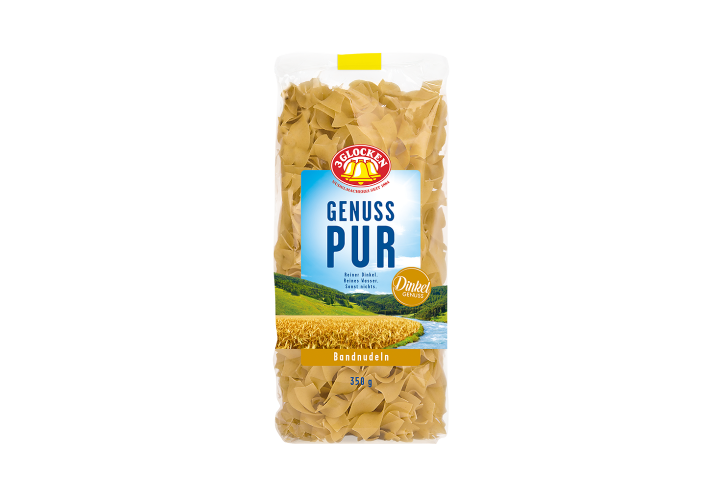 3 GLOCKEN GENUSS PUR Dinkel Bandnudeln eigenen sich besonders gut für leichte Ragouts oder kurz gebratenes oder gegrilltes Gemüse. Durch ihren leicht nussigen, ursprünglichen Geschmack sind sie eine leckere, gesunde Alternative.