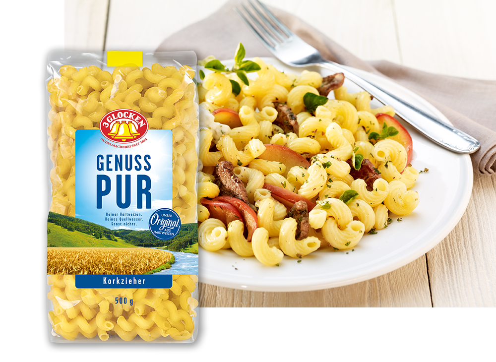 Nudeln nach Packungsanweisung zubereiten und beim Abgießen 100 ml Nudelwasser auffangen. Nudeln und Nudelwasser mit Filet und Äpfeln vermischen und mit Salz und Pfeffer würzen. Majoran-Nudeln auf Teller anrichten, mit Kräuterschmand garnieren und servieren.