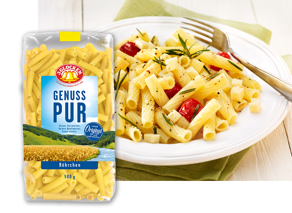 Nudeln, Nudelwasser, Tomaten und marinierten Rosmarin (evtl. vorher klein schneiden) vermischen und mit Salz und Pfeffer würzen. Nudelmischung auf Teller anrichten, Käsewürfel darüber geben und servieren.