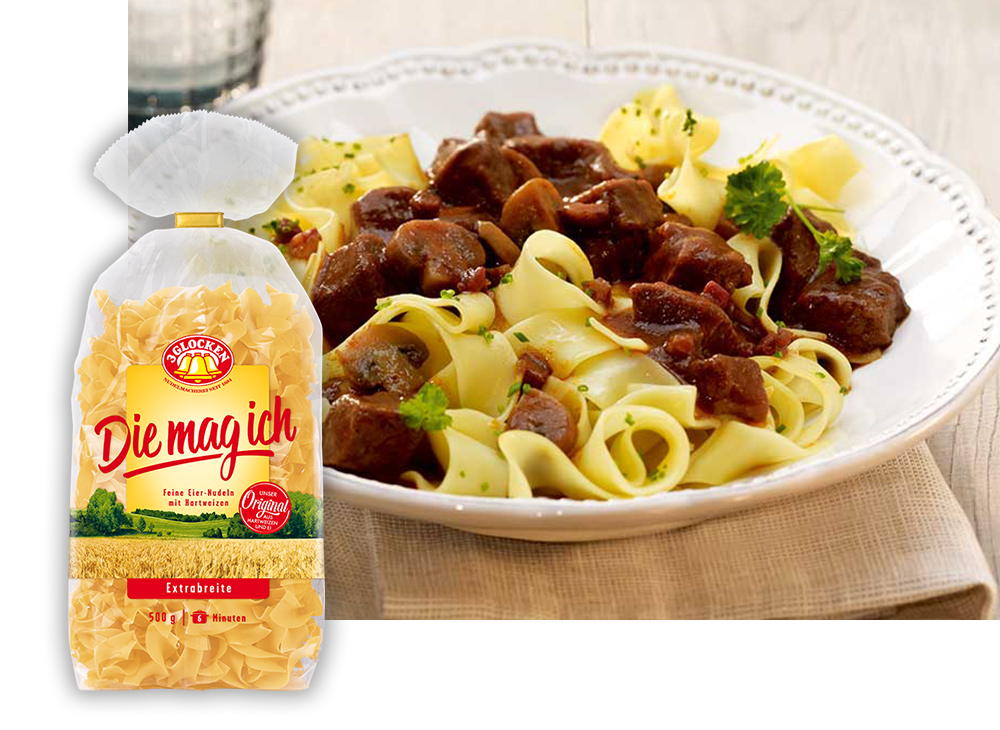 Fond und Rotwein angießen, Gewürze und Majoran dazugeben und abgedeckt ca. 70 – 80 Minuten schmoren. Nudeln nach Packungsanweisung zubereiten.