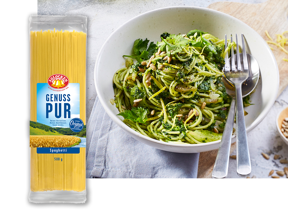 Mangoldblätter, Knoblauch, ca. 2/3 Sonnenblumenkerne, Petersilie, 50 ml Olivenöl und Nudelwasser in einem hohen Gefäß mit einem Stabmixer fein pürieren. Mit Salz, Pfeffer und geriebener Zitronenschale abschmecken.