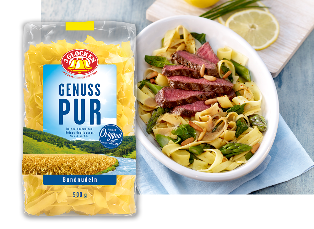 Nudeln zubereiten, zufügen, mit Crème fraîche verfeinern, würzen, Pinienkerne überstreuen.